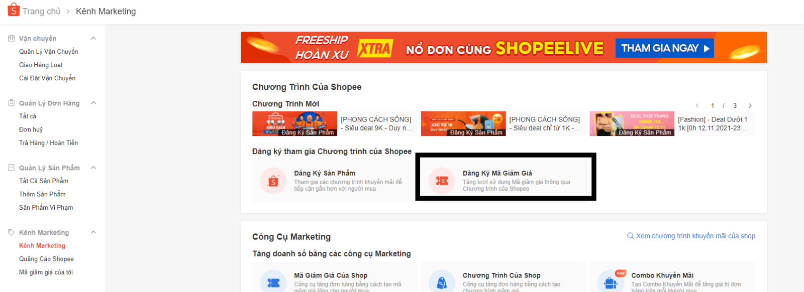 Chương trình mã giảm giá là một trong những chương trình Marketing của Shopee. Với mục đích giúp người bán dễ dàng hiển thị mã giảm giá của Shop và thu hút người dùng nhanh chóng đến với gian hàng. Sau khi đăng ký thành công, mã giảm giá sẽ có cơ hội hiển thị ở vị trí tốt hơn tại các banner ở trang chủ hoặc trang ngành hàng.