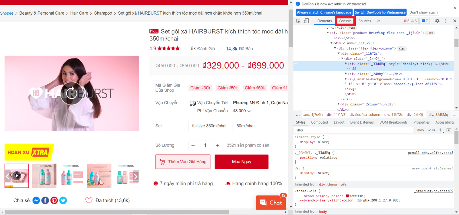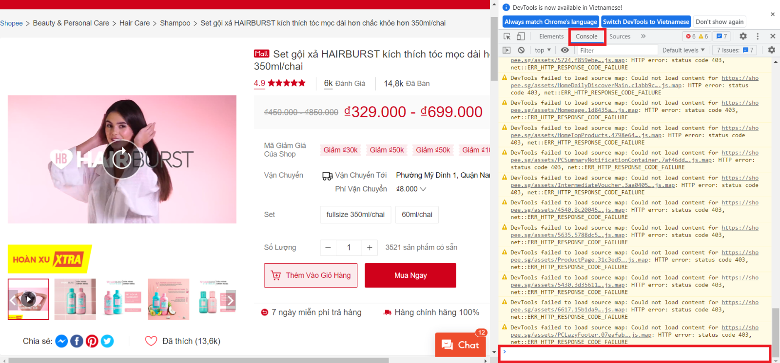 Bước 3: Sau khi mở thành công mục Console của trang sản phẩm bạn hãy copy đoạn code bên dưới và dán vào dòng cuối cùng của mục Console. Mã code của công cụ: