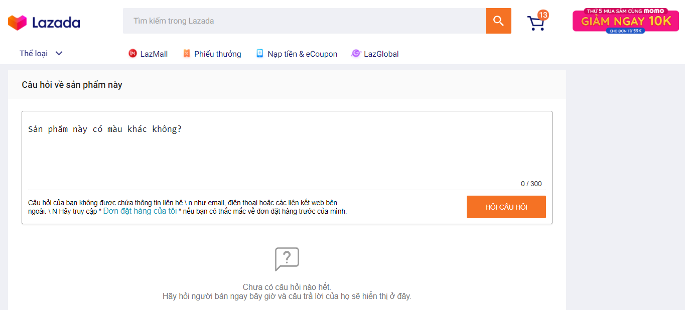 Khác với trên ứng dụng Lazada trên điện thoại, bạn sẽ không tìm thấy mục chat với shop trên trang chi tiết sản phẩm trên máy tính. Bạn chỉ có thể Đặt câu hỏi bằng cách kéo xuống phía dưới tới gần hết trang sẽ thấy mục này.