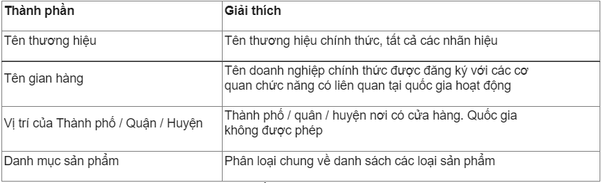 Một số lưu ý là: Với tên ngành hàng là tùy chọn và chỉ áp dụng trong trường hợp thương hiệu có sản phẩm thuộc nhiều ngành hàng khác nhau. Với tên thành phố là tùy chọn và chỉ áp dụng trong trường hợp nhà bán hàng có mặt ở nhiều thành phố khác nhau.