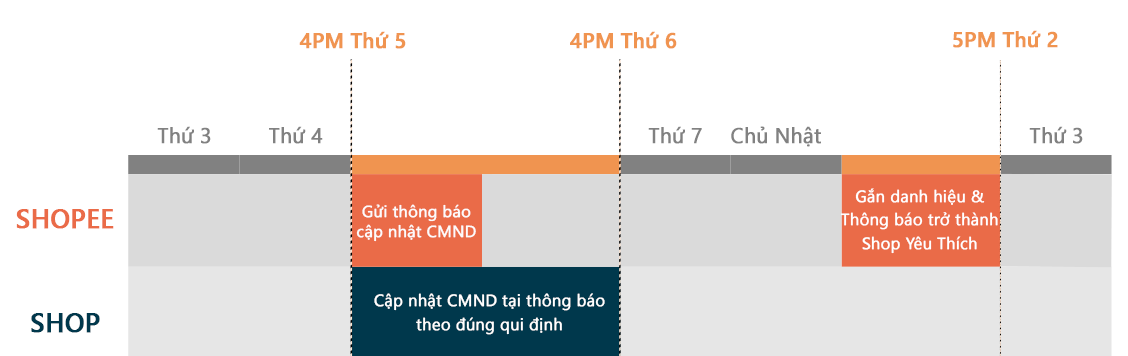 Shopee sẽ bắt đầu xét duyệt vào lúc 16 giờ - thứ Năm hàng tuần và gửi thông báo cập nhật CMND cho các Shop. Các Shop sẽ cập nhật CMND tại thông báo theo đúng quy định trước 16 giờ - thứ Sáu cùng tuần nhận thông báo từ Shopee. Còn thời gian kết thúc xét duyệt là thứ Hai tuần kế tiếp. Nếu thoả mãn điều kiện, Shopee sẽ được gắn danh hiệu Shop Yêu Thích và gửi thông báo cho các Shop.