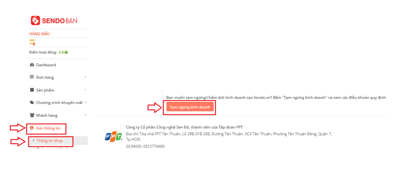 Shop cần đọc hiểu các điều khoản và tự thực hiện thao tác “Tạm ngừng kinh doanh” trên tài khoản Shop tại trang quản trị ban.sendo.vn.