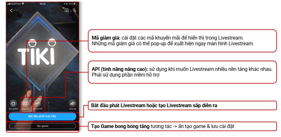 Thiết lập hiển thị Livestream: Tạo Game bong bóng, mã giảm giá, bạn nên tạo mã giảm giá ưu đãi hấp dẫn của sản phẩm và thêm vào livestream để thu hút khách hàng nhanh chóng.