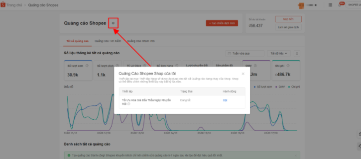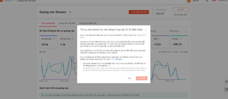 Shop sẽ nhìn thấy thông báo khi truy cập vào mục Quảng cáo Shopee (trên Kênh Người Bán) vào các chiến dịch khuyến mãi của Shopee (như 10.10, 15.1). Khi đó Shop có thể điều chỉnh thiết lập tại thông báo này.