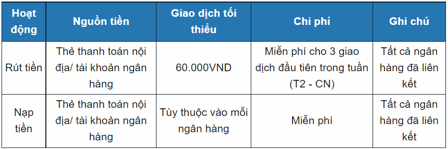 Từ ngày 01/02/2021, biểu phí khi khách hàng thực hiện giao dịch nạp tiền và rút tiền về tài khoản ngân hàng đã liên kết qua Ví điện tử ShopeePay như sau: