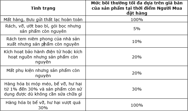 - Trong mọi trường hợp, khoản tiền bồi thường sẽ không vượt quá giá bán sản phẩm mà người bán đã niêm yết trên tại thời điểm người mua đặt hàng. Shopee có quyền từ chối bồi thường cho người bán nếu người bán gửi hàng hóa sai khác so với nội dung sản phẩm đã đăng ký trong đơn hàng.
