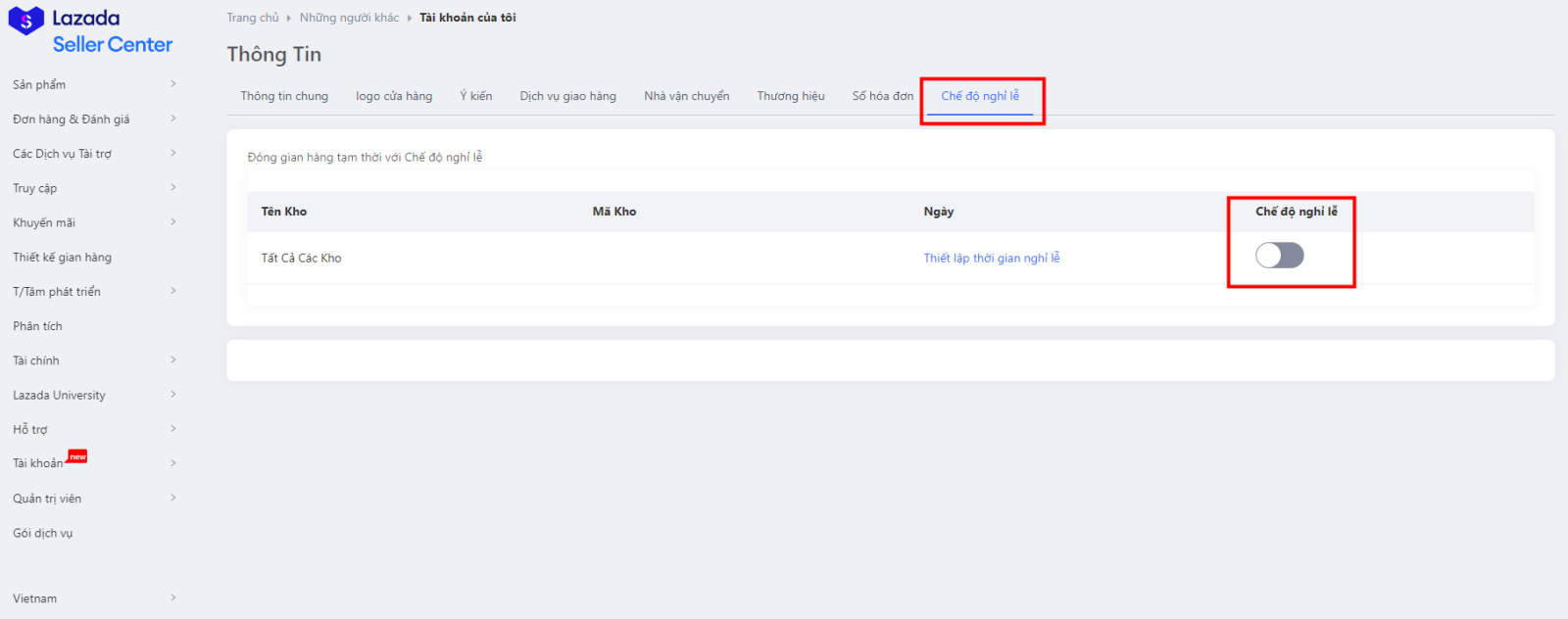 Tuy nhiên sẽ không tránh được việc NBH sẽ có các giai đoạn nghỉ lễ và không có nhân lực để xử lý đơn hàng nên Lazada khuyến khích NBH chuyển gian hàng sang chế độ nghỉ lễ. Việc này sẽ tránh mang đến trải nghiệm không tốt cho khách hàng cũng như đánh giá tiêu cực cho gian hàng khi họ đặt đơn hàng trong thời gian không hoạt động.