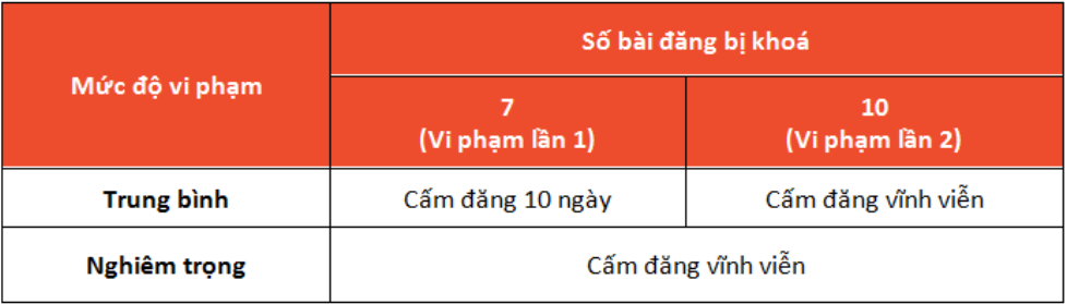 Nếu người nán vi phạm nhiều lần, hình thức phạt cao nhất sẽ được áp dụng đối với người bán đó chính là bài đăng sẽ bị khóa đồng thời tài khoản cũng sẽ bị khóa vĩnh viễn dựa trên hình thức phạt dành cho hành vi nghiêm trọng.
