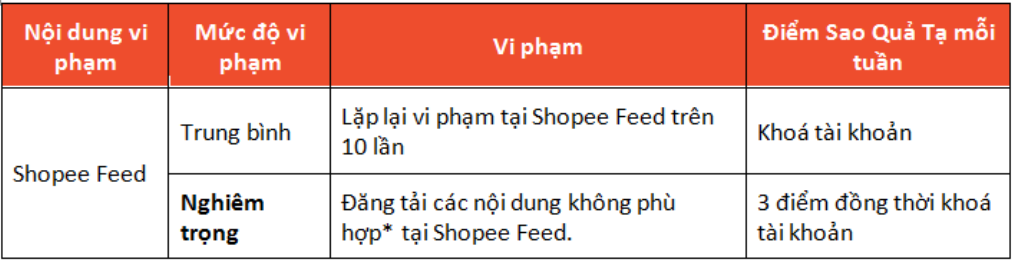 Ngoài việc bị cấm đăng bài trên Shopee Feed, điểm phạt sẽ được áp dụng cho những người vi phạm bất hợp tác dựa trên hệ thống Sao Quả Tạ đối với những nội dung vi phạm nghiêm trọng.