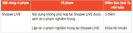 Ngoài việc bị cấm livestream tại Shopee Live, điểm phạt sẽ được áp dụng cho những người vi phạm bất hợp tác dựa trên hệ thống Sao Quả Tạ đối với những nội dung vi phạm nghiêm trọng.