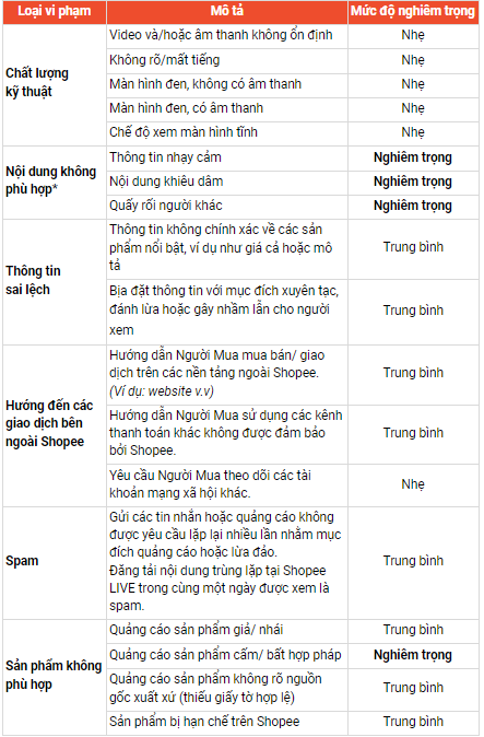 2. Các loại vi phạm áp dụng cho Shopee Live