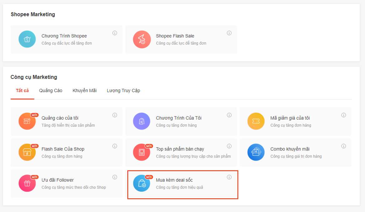 Mua kèm deal sốc là một công cụ Marketing trên Kênh Người Bán với 2 chương trình: Giảm giá khi mua kèm và Mua để nhận quà.