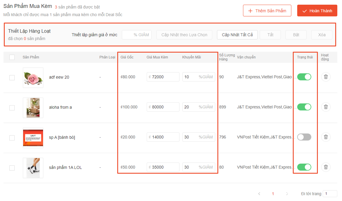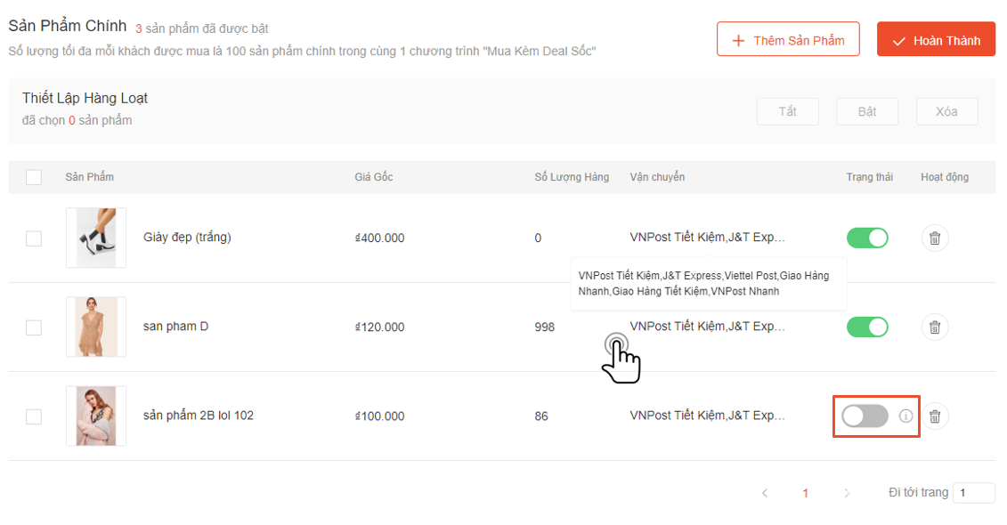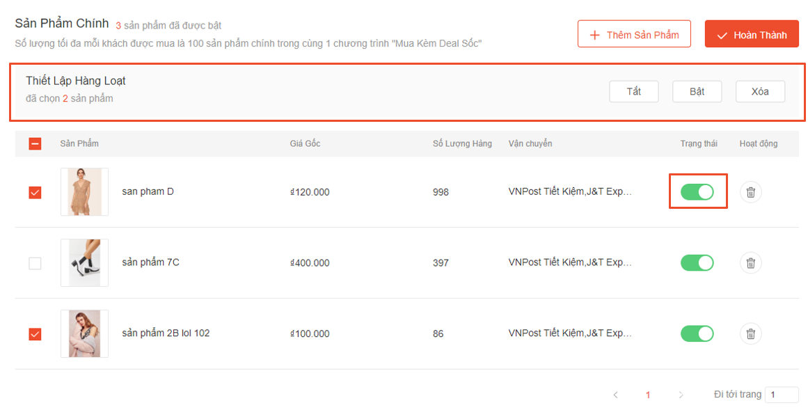 Gạt nút xanh cho từng sản phẩm hoặc dùng “Thiết lập hàng loạt” để kích hoạt tất cả sản phẩm một lúc bằng cách đánh dấu tất cả sản phẩm rồi chọn “Bật”.