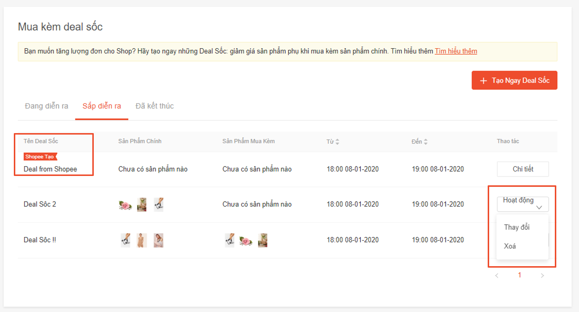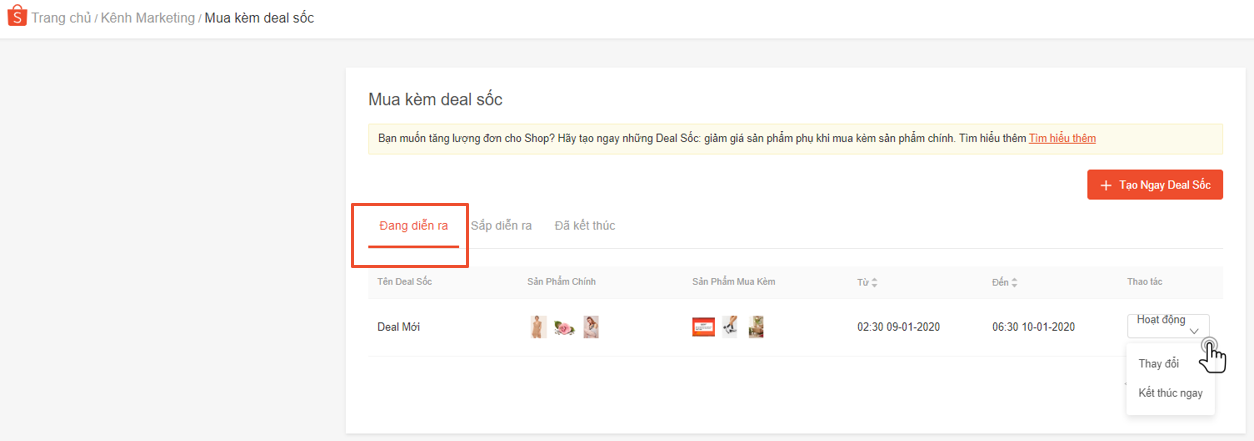 Người bán có thể sửa các deal “Đang diễn ra” hoặc “Sắp diễn ra” bằng cách chọn nút “Hoạt động” >> “Thay đổi”