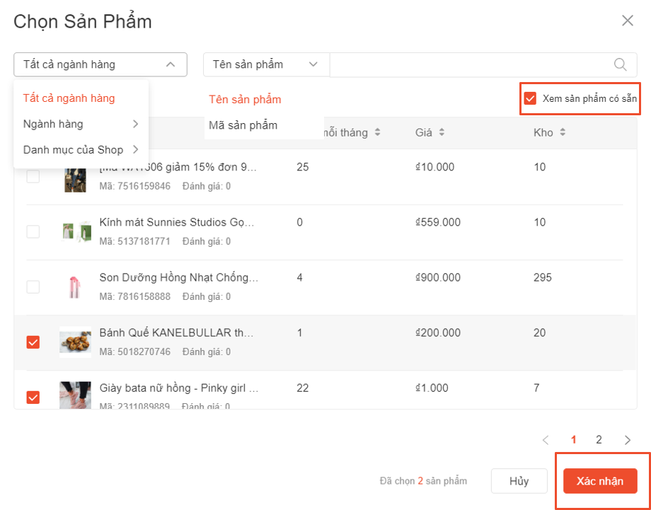 Chọn ô Xem sản phẩm có sẵn để lọc ra những sản phẩm đủ điều kiện tham gia chương trình.