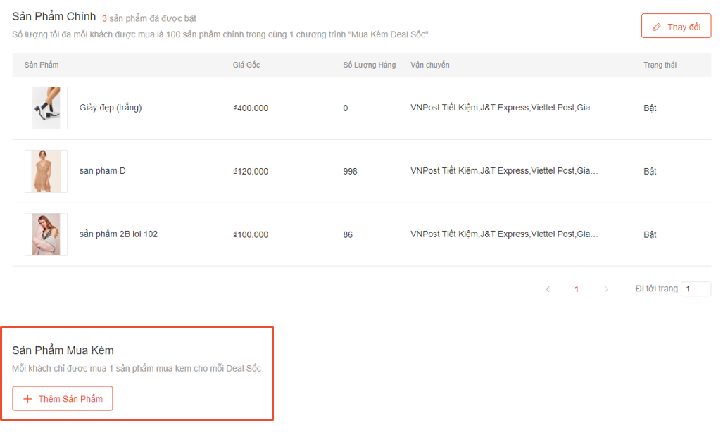 Chọn “Thêm sản phẩm” để thêm các sản phẩm chính. Shop có thể chọn lên đến 100 sản phẩm chính.