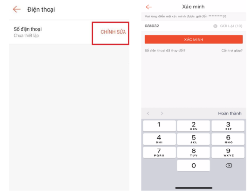 Bước 2: Chọn Chỉnh sửa và nhập số điện thoại của bạn + mã xác nhận được gửi qua số điện thoại bạn đã nhập.