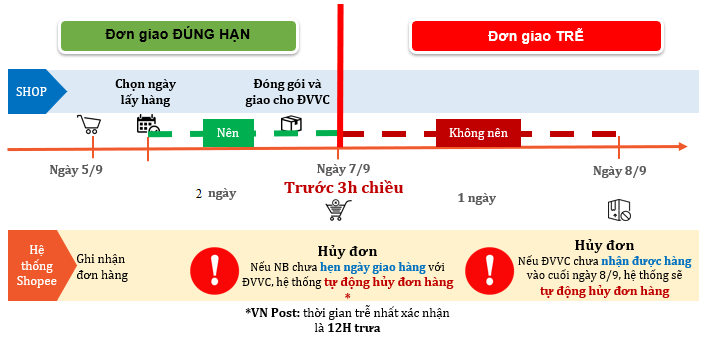 VD: Đơn hàng phát sinh vào ngày 5/9 phải được xác nhận trễ nhất trước 3 giờ chiều ngày 7/9 và phải giao hàng cho đơn vị vận chuyển trong ngày 7/9 mới được tính là đơn hàng giao đúng hạn.