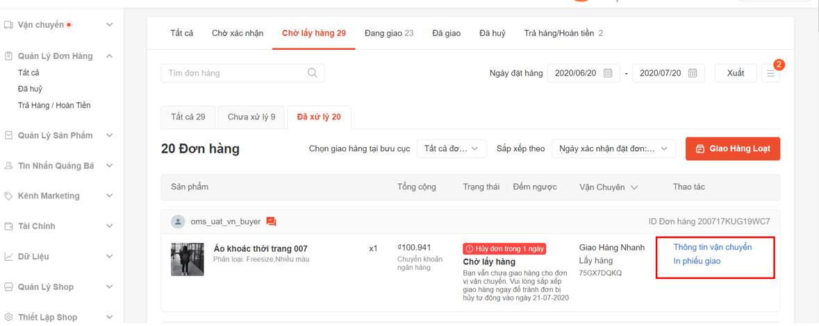 Sau khi bên vận chuyển duyệt đơn thành công, phần trạng thái đơn hàng sẽ xuất hiện dòng chữ Xem thông tin vận chuyển. Ở đây bạn sẽ thấy mã vận đơn và phiếu giao hàng. Đây là loại giấy tờ khi bạn đóng gói sẽ dán vào bên ngoài của thùng hàng.