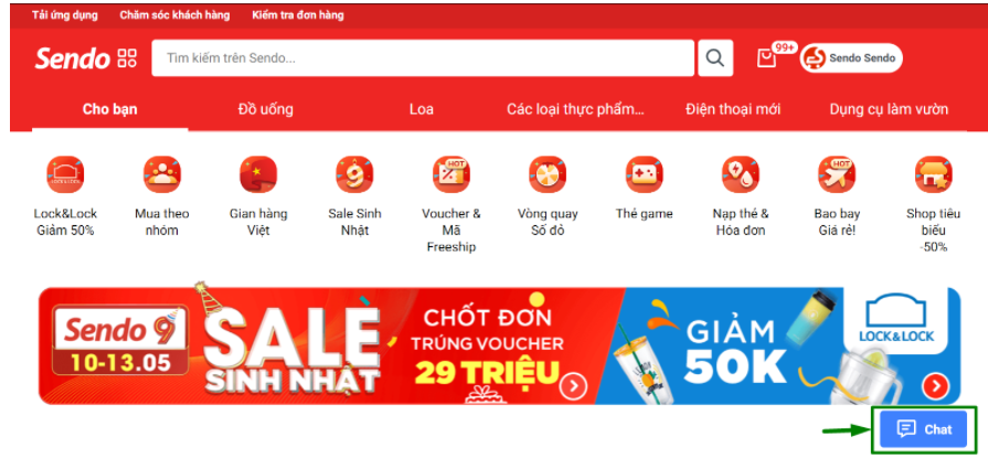 + Đầu tiên đăng nhập tài khoản tại website Sendo.vn nhấn vào biểu tượng “chat”