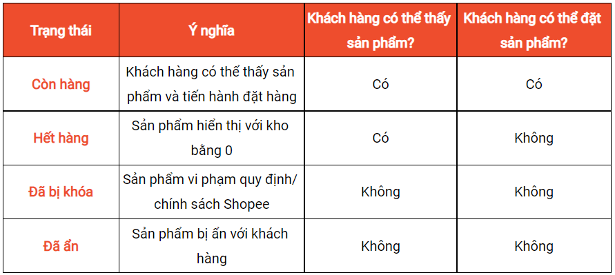 Khi truy cập vào mục Tất cả sản phẩm trong Kênh bán hàng, bạn sẽ thấy danh sách sản phẩm được phân loại theo 4 trạng thái sau: Đang hoạt động, hết hàng, vi phạm và đã ẩn. Những trạng thái này thể hiện việc khách hàng có thể nhìn thấy được sản phẩm trên shop hay không.