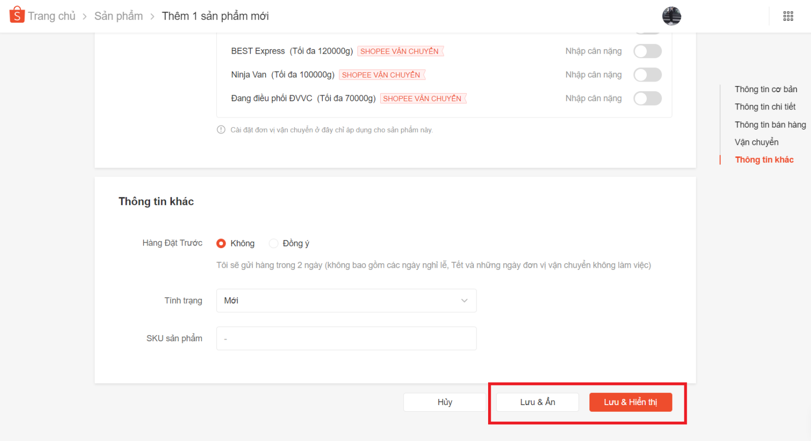 • Lưu & hiển thị để sản phẩm được hiển thị ngay lập tức trên trang Shopee.