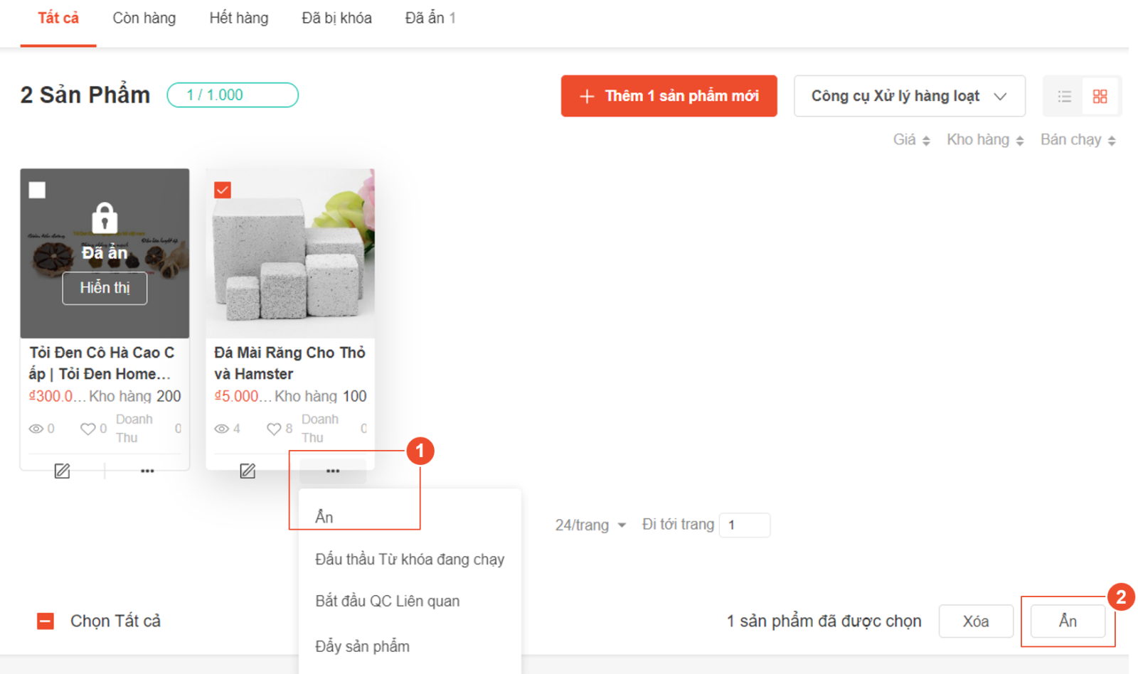 - Ẩn từng sản phẩm: Để ẩn từng sản phẩm, bạn chỉ cần chọn nút “…” dưới mỗi sản phẩm rồi bấm Ẩn.