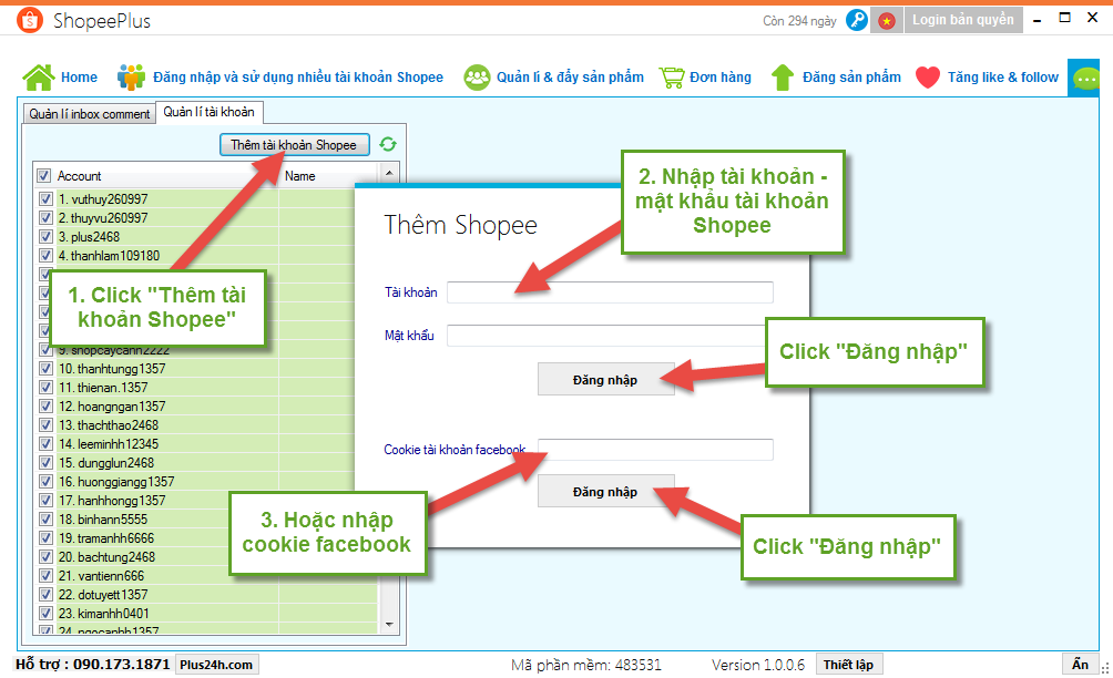 - “Thêm tài khoản Shopee”: Click để thêm tài khoản Shopee