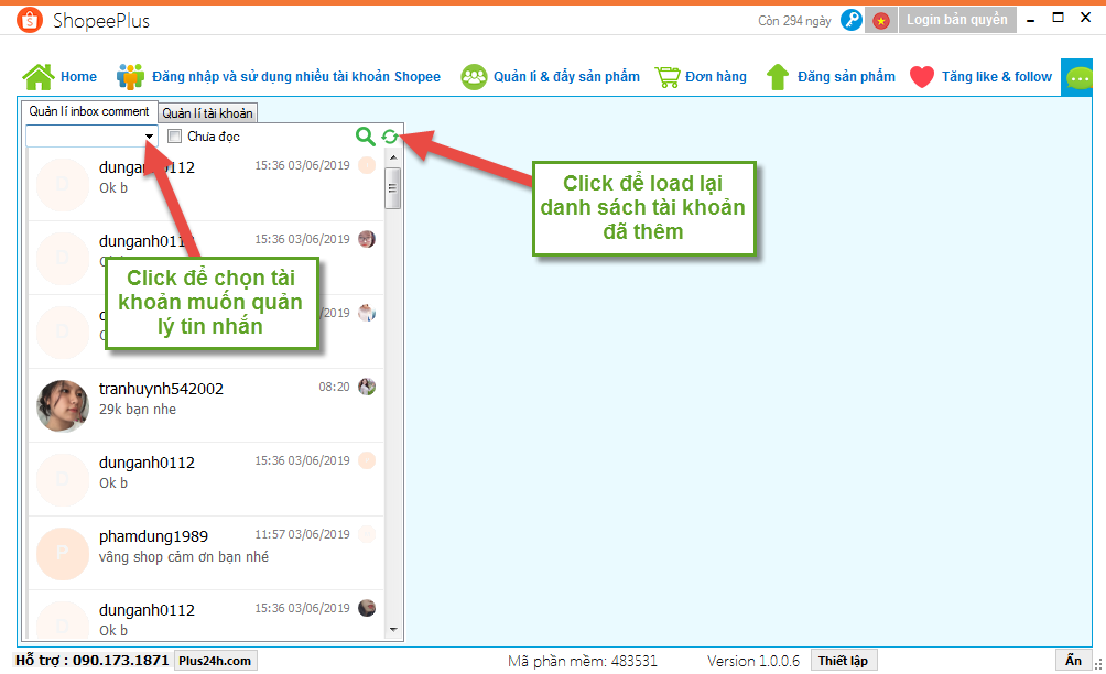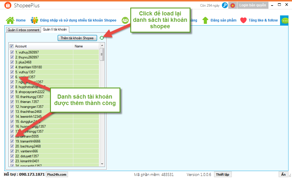 - Click vào biểu tượng màu xanh – reload để load lại danh sách tài khoản Shopee đã được bạn thêm thành công trong mục quản lý tài khoản và tham gia vào quá trình quản lý inbox comment.