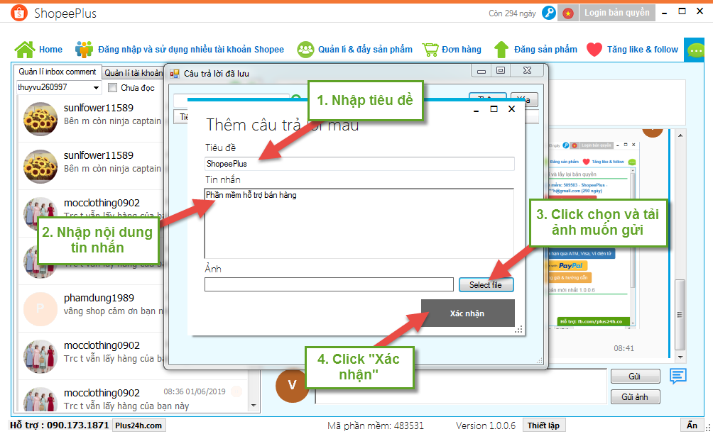 - Xác nhận: Click để xác nhận thêm thành công tin nhắn mẫu