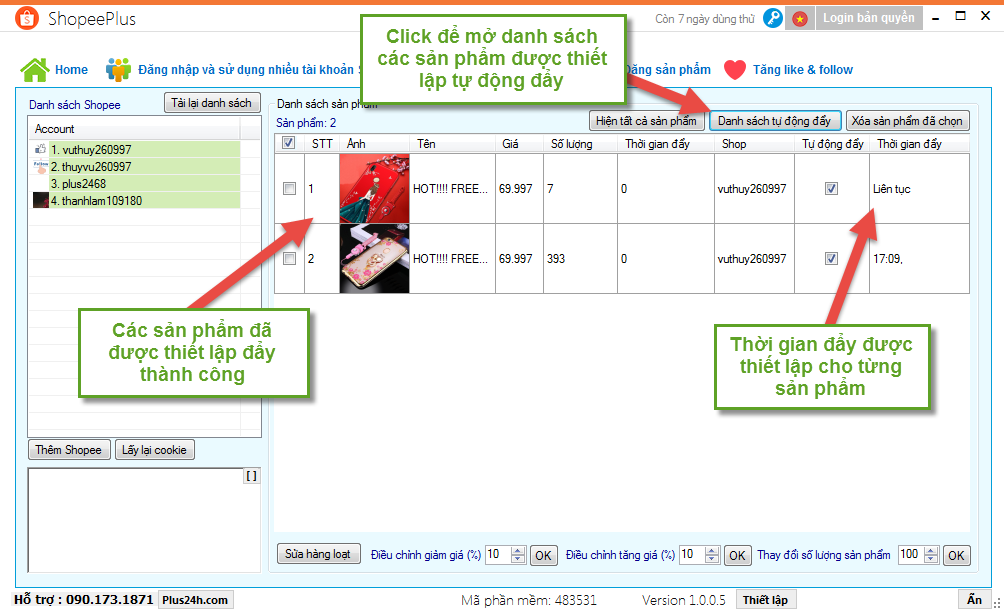 Danh sách các sản phẩm đã được thiết lập tự động đẩy thành công:
