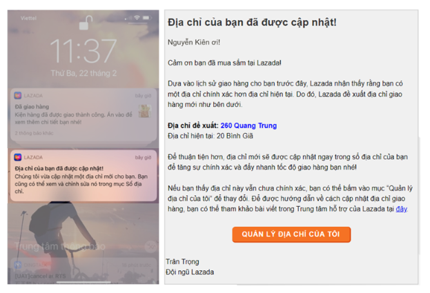 Tự động cập nhật địa chỉ giao hàng là Khi đơn hàng được giao thành công, nếu có sự thay đổi về địa chỉ giao hàng, bạn sẽ nhận được một thông báo trên Ứng dụng Lazada và email đặt hàng của bạn, với nội dung như hình minh hoạ bên dưới.