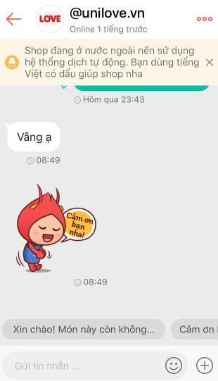 Sau khi nhận được tin nhắn thắc mắc của khách hàng người bán nên nhanh chóng trả lời giải đáp cung cấp những thông tin cần thiết cho người mua. Lưu ý người bán nên phản hồi nhanh nhất có thể và trước 12h khi tin nhắn đến. Ngoài ra bạn nên phản hồi tất cả tin nhắn của khách hàng dù đó là tin khách hàng đáp lại như “vâng ạ”, “đồng ý mua hàng”. Đối với tin nhắn không phải câu hỏi thì shop nên gửi sticker để phản hồi lại tin nhắn của khách hàng.