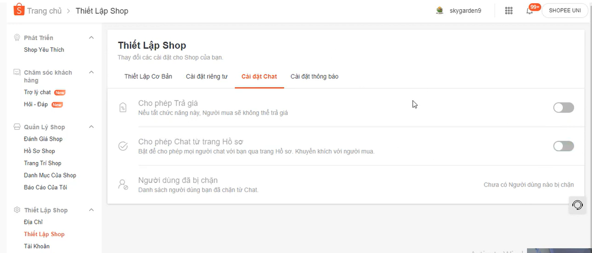 Để tăng tỉ lệ phản hồi chat cho shop và hạn chế các tin nhắn dịch vụ quảng cáo ảnh hưởng đến chỉ số này. Bạn nên cài đặt chat và tắt một số tính năng trong phần cài đặt như sau: